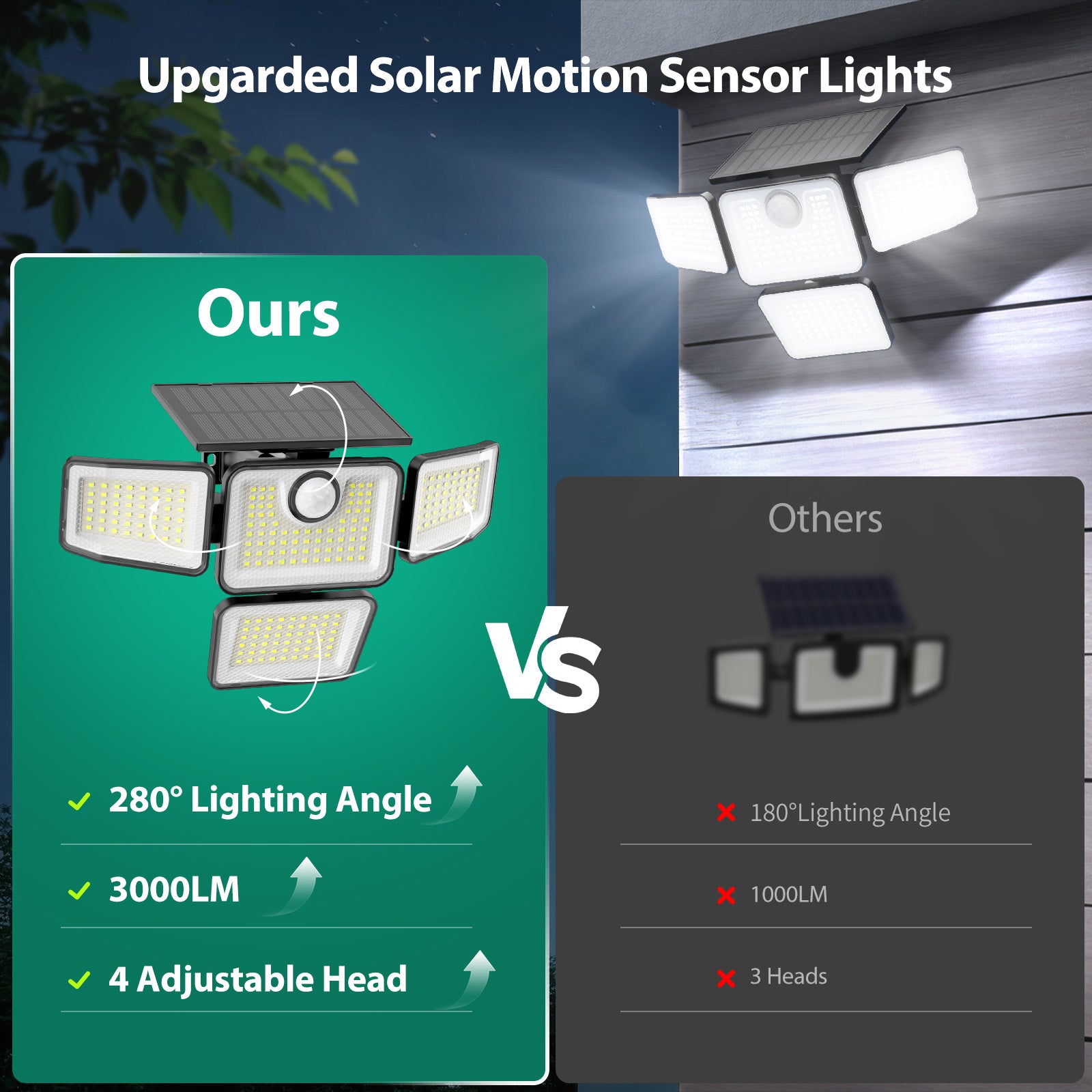 Omibee 3000LM 4 Heads Solar Motion Sensor Lights