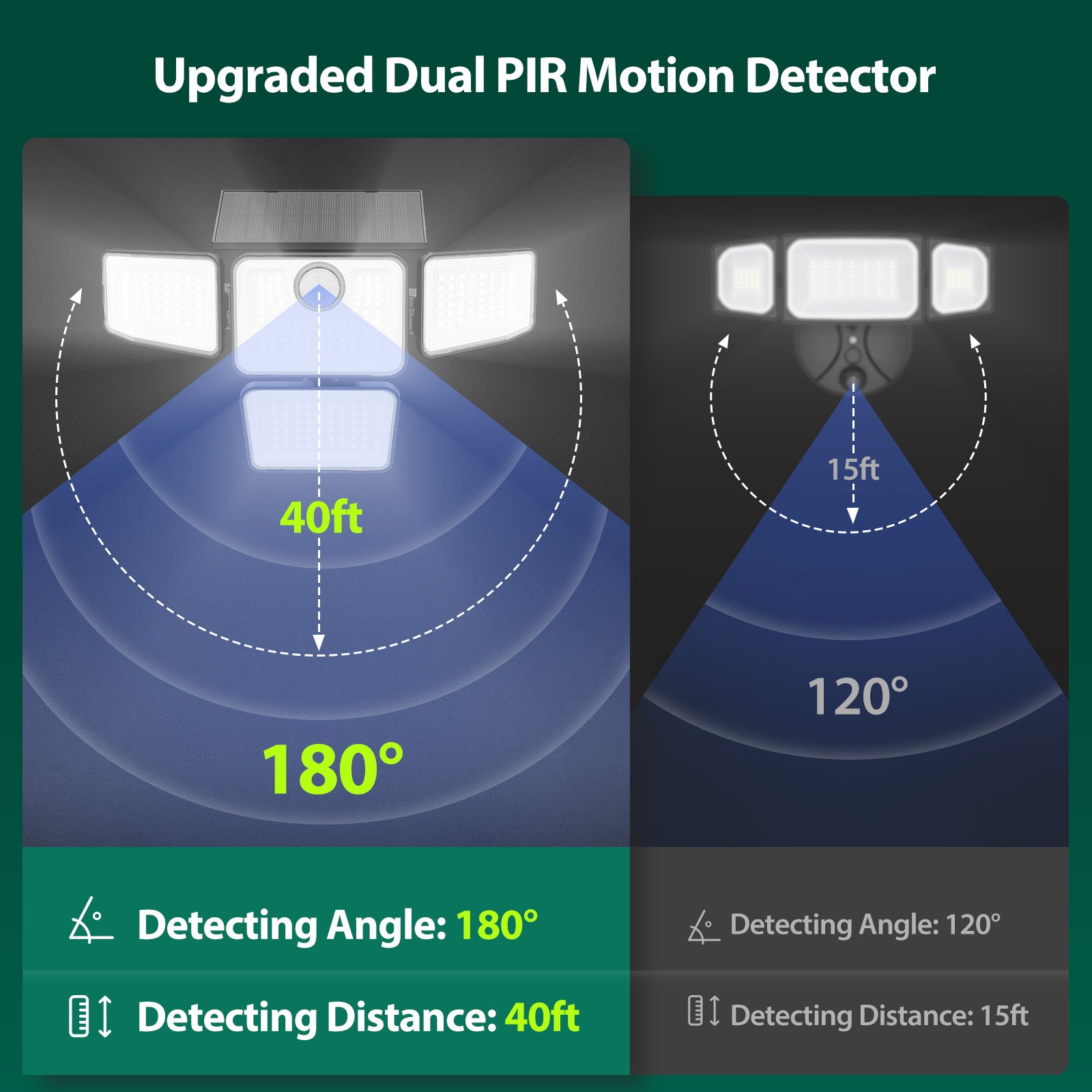 - 【 PIR Motion Sensor】 The PIR motion sensor lights can detect the distance up to 26ft away in a 120°range. The outdoor lights solar powered come with a remote control that allows you to easily adjust 3 different modes. ① Sensor mode: When people come, the light turns on at 100% brightness. The light turns off 20 seconds after people leave. ② Dim&sensor mode:When people come, the light is at 100% brightness. The light is always on at 3% brightness 20 seconds after people leave. ③ Dim mode: The light stays on at 10% brightness at night without infrared induction.
